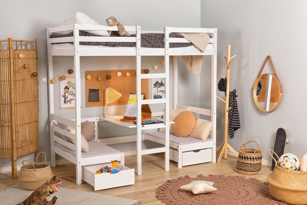 Loftsäng med sängloft och stege samt sittyta på nedervåninen med två bänkar och bord. Under bänkarna finns praktiska förvaringslådor för dina leksaker eller böcker. Sängen passar perfekt till barnrummet där den fungerar som säng, pysselhörna och förvaring – allt på samma utrymme som en enkelsäng.