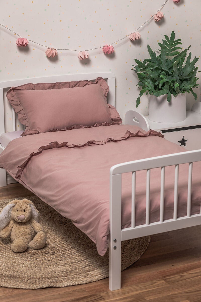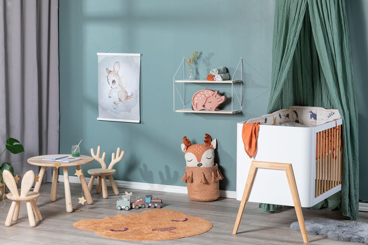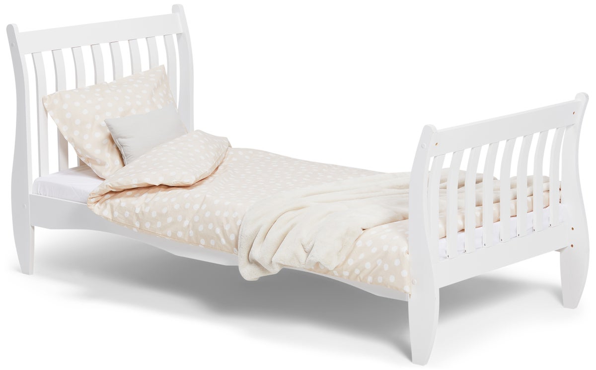 Enkelsäng tillverkad i slitstark furu med höga gavlar med spjälor. Sängen är designad med runda vågiga linjer som ger en elegant touch till barnrummet.