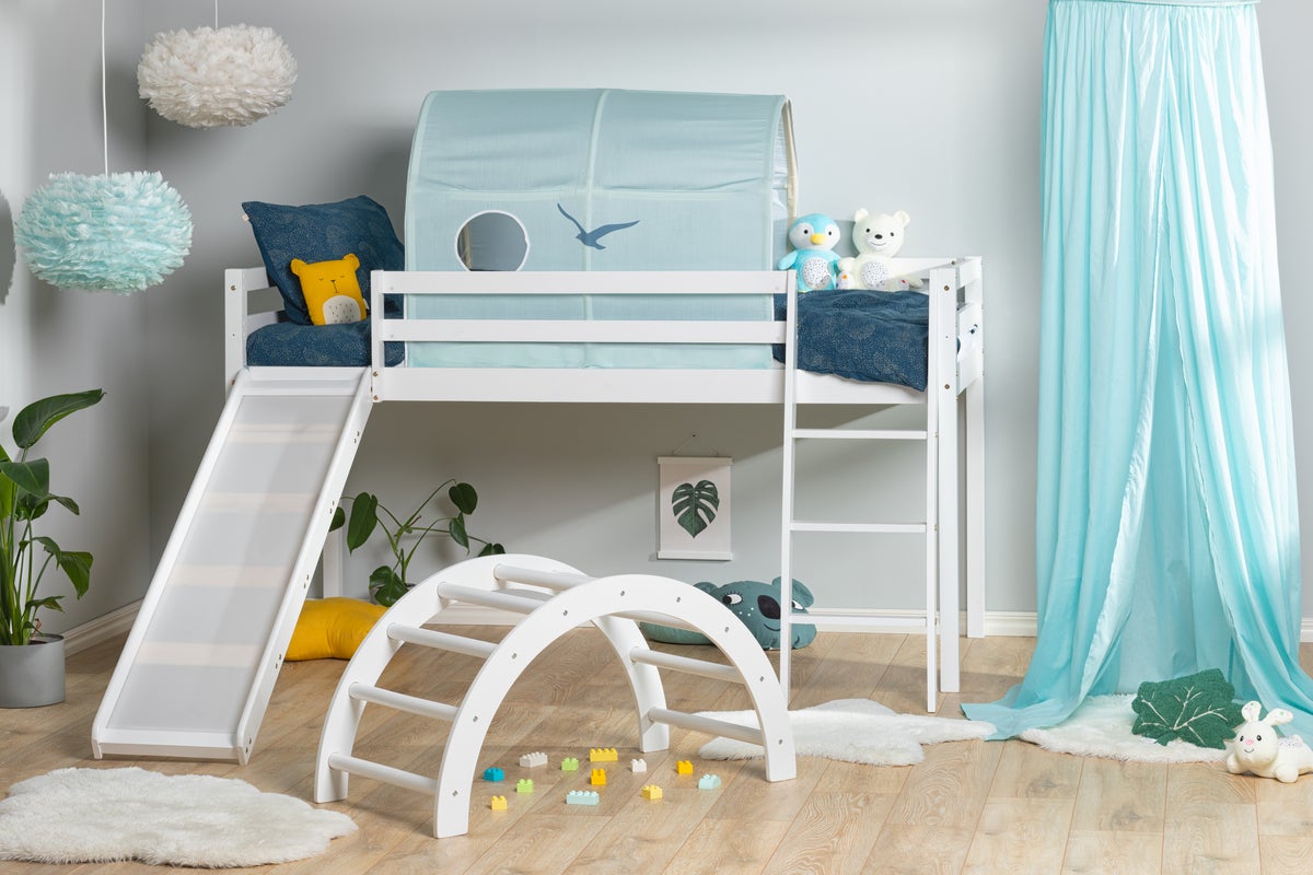 Loftsäng utrustad med stege, rutschkana och tält över sängen. Tältet har två runda fönster och skapar ett mysigt litet krypin ovanpå sängen. Den svagt lutande stegen gör det lätt att ta sig upp till sängloftet, och rutschkanan blir ett roligt lekmoment när barnet ska ner igen. Stege och rutschkana kan monteras på valfri sida.Sängen är anpassad för madrass med måtten 90 x 190 cm. Går att köpa med eller utan madrass. Maxvikt: 120kg