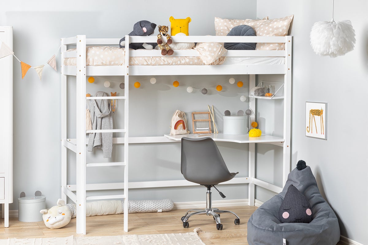 Loftsäng Med Skrivbord 90x190, Vit Loftsäng tillverkad i slitstark furu med trappstege och skrivbord under sängen. Sängen kombineras med en madrass med måtten 90x190 cm (köps separat). Loftsängen med skrivbordsplats och säng passar perfekt till barnrummet när du vill spara plats och samtidigt kombinera fördelarna med skrivbord och säng i en och samma möbel. Den medföljande stegen kan monteras på valfri sida. Maxvikt: 120kg